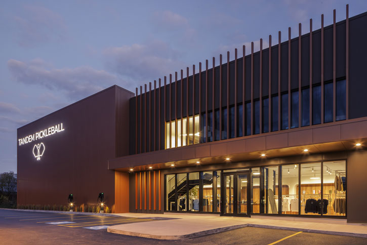 Le concept architectural exprime une signature contemporaine, sobre et élégante, attrayante pour la clientèle visée. La façade se veut dynamique à l’image de ce sport rassembleur.